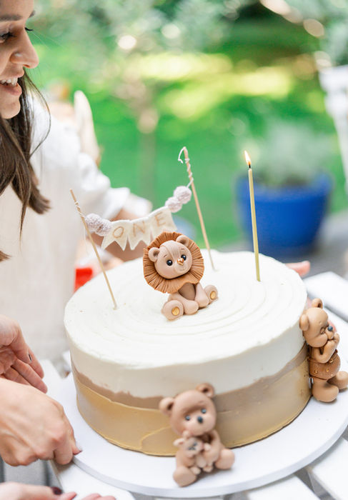 Despite the 41-degree heat, the mood stayed joyful and light. The table was beautifully set under the trees, decorated with blue glassware and fresh flowers, while a small lemonade and ice cream stand offered a welcome touch of coolness. The theme, a gentle little lion (just like Luca’s zodiac sign) added a sweet, personal touch to the celebration.